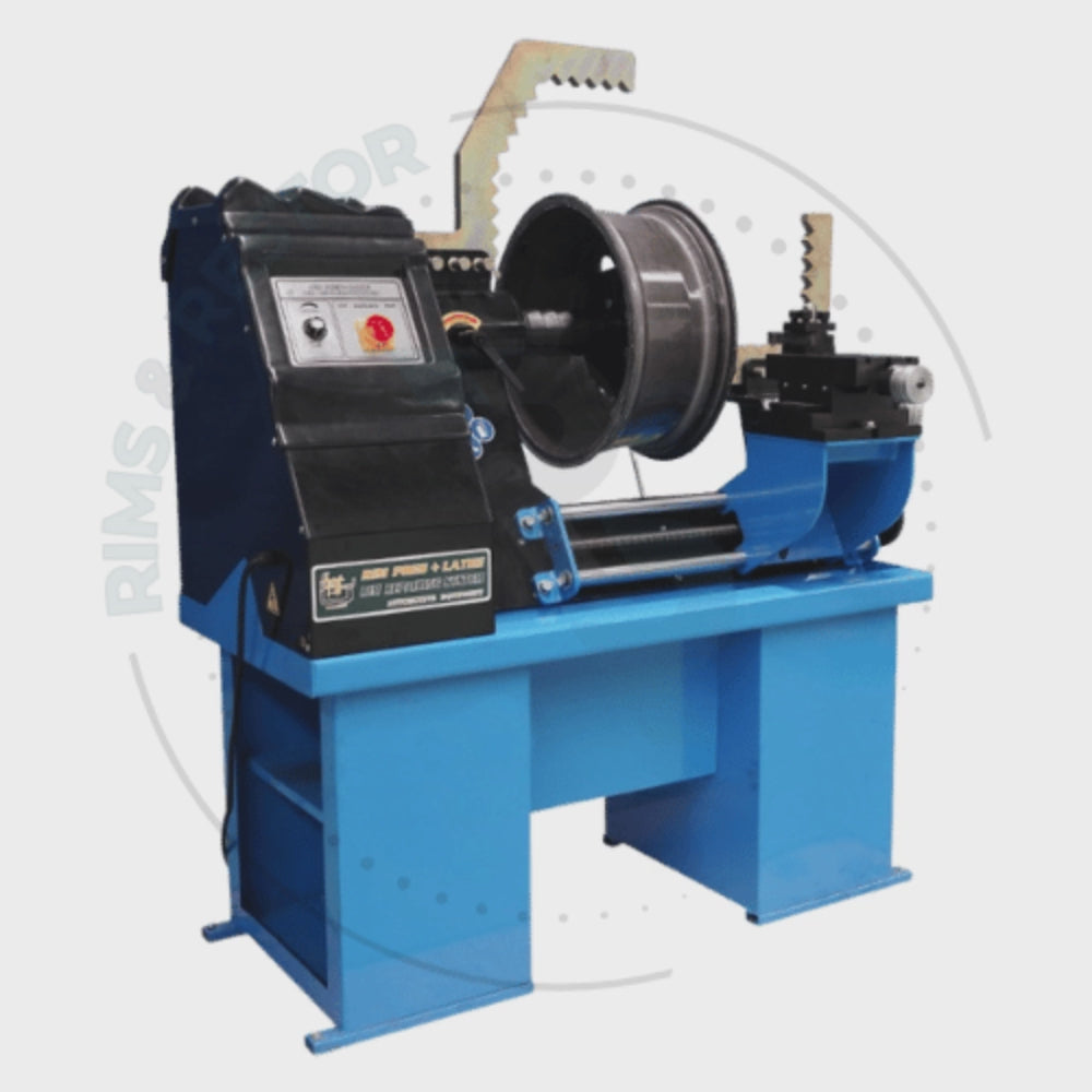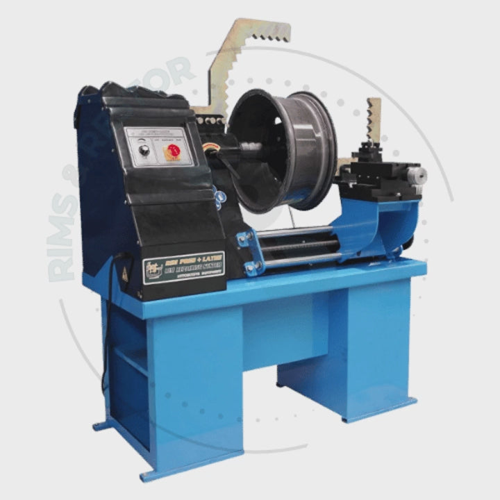 Après redressage, le tour intégré permet de reprendre le bord de la jante et de lui redonner une rondeur parfaite. Une réparation complète, du diagnostic à la finition finale.